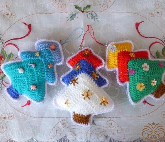 Елочка-подвеска связана крючком, украшена снежинками, бусинками, паетками.