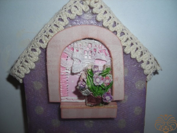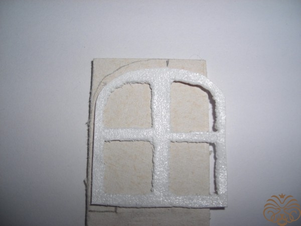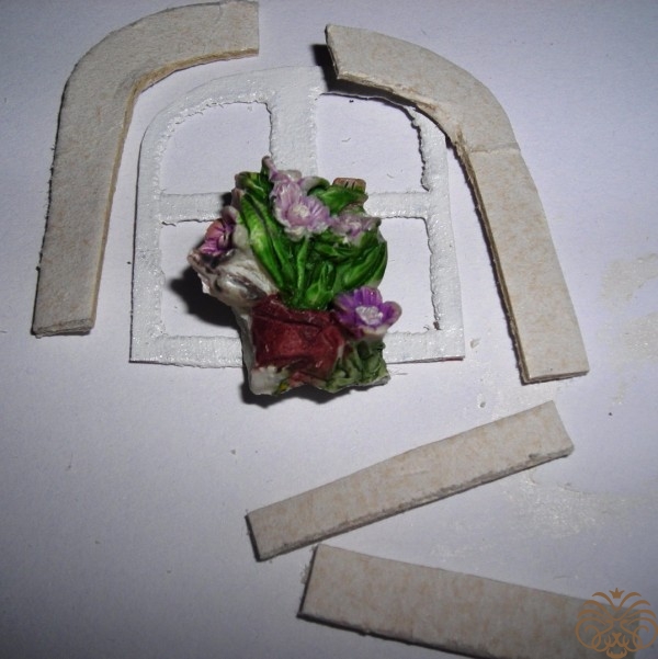 На арочку с обратной стороны наклеиваем маленькие кусочки переплетного картона для объема. Формируем окно. Арочка, подоконник немного пошкурены по краям и затонированы штемпельной подушечкой. К пенке приклеиваю на «Момент Кристалл», салфетка и слои лака не дают разъесть слой пенки. Цветок в горшке (обломок керамической фигурки) чудесно вписался, также придаёт объем. Мое окошко без подоконника - 4*4 см. Подоконник – два прямоугольника 0,7*3 см.