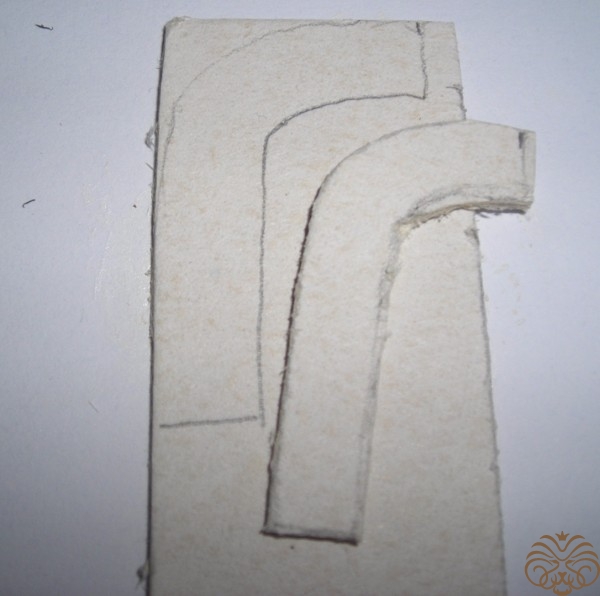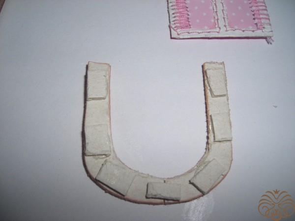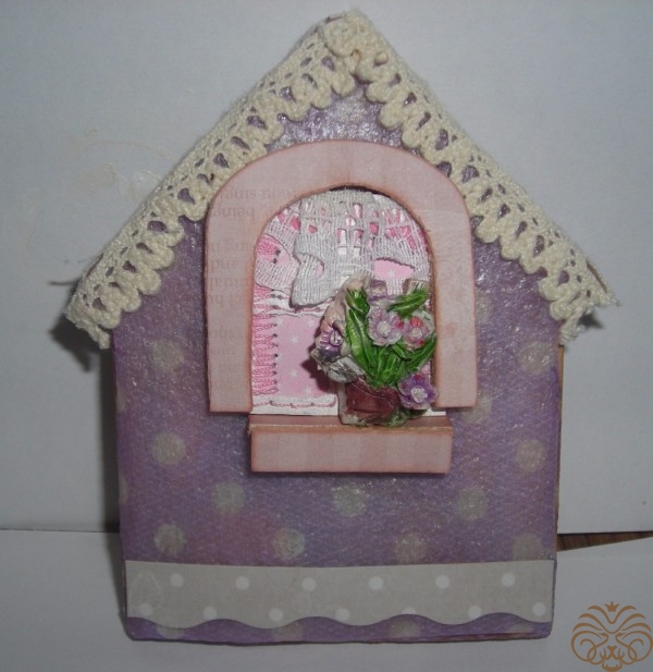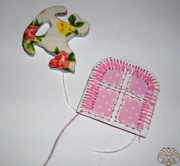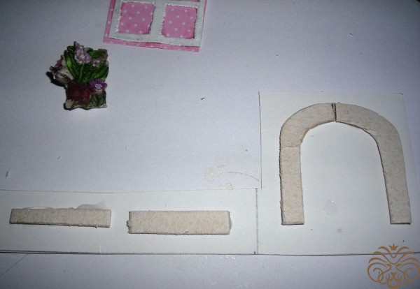 Приступаем к изготовлению окошка. Заготовка окошка уже окрашена белой акриловой краской. Из переплетного картона делаем наличники-арочку и два прямоугольника для подоконника. Подоконник объемный. На нем будет стоять горшок с цветком. Обводим, вырезаем, приклеиваем на скрапбумагу, еще раз вырезаем, склеиваем детали подоконника. Под заготовку окна подкладываем прямоугольник розовой бумаги, приклеиваем, обрезаем.