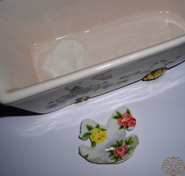Раскладываем декоративные элементы на поверхности магнита. Магнит с неудачным декупажем. Ничего не отдирается, покрыт лаком. Есть неровные места. Решено закрыть картинку упаковочной пенкой и сделать декупаж уже на ней. Пенка белая, почти не просвечивает, мягкая, придаёт объем. Приклеиваем на ПВА, от Момента пенку разъест. После склеивания кладем под пресс до полного высыхания.