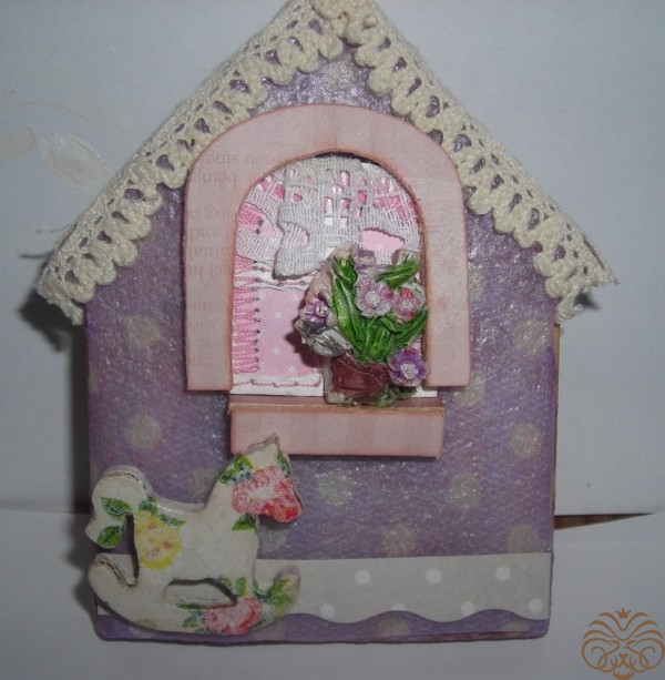 Мне очень нравится работы, оформленные в детском, очень нежном стиле (Baby). Идея моей работы – комната с окошком, подоконником, цветами на подоконнике и детскими игрушками около окошка на полу. Всё в нежных фиолетово-розово-бежевых цветах, принт в горошек и мелкий цветочек.