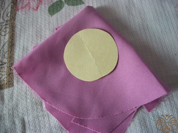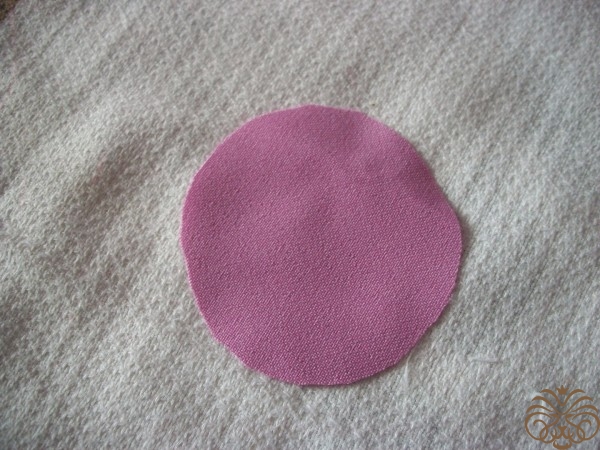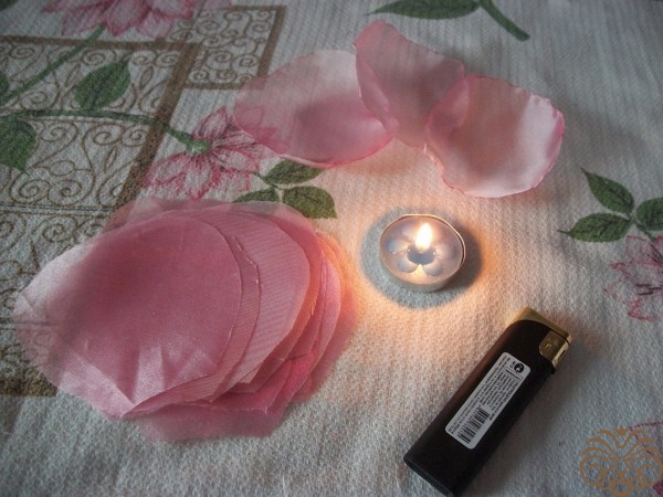 После того как все лепестки опалили, берем наше основание из плотной ткани и приклеиваем на него лепестки по кругу.Приклеиваем лепестки с нахлестом друг на друга. Когда все лепестки приклеены в серединку приклеиваем стразу.