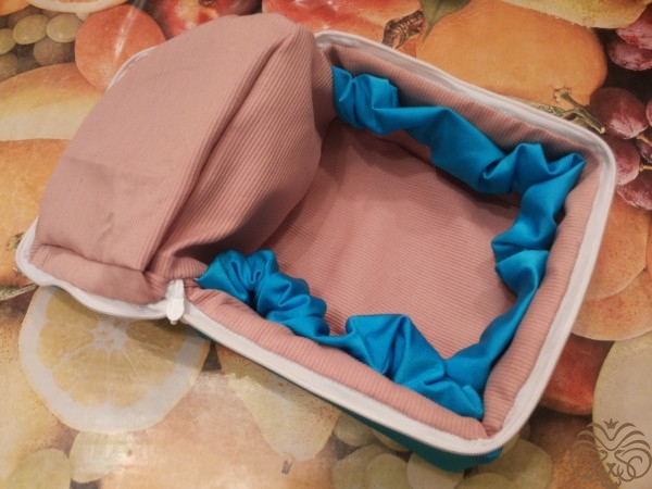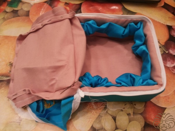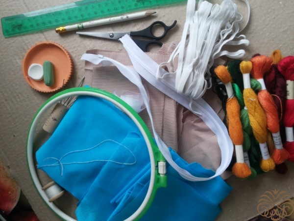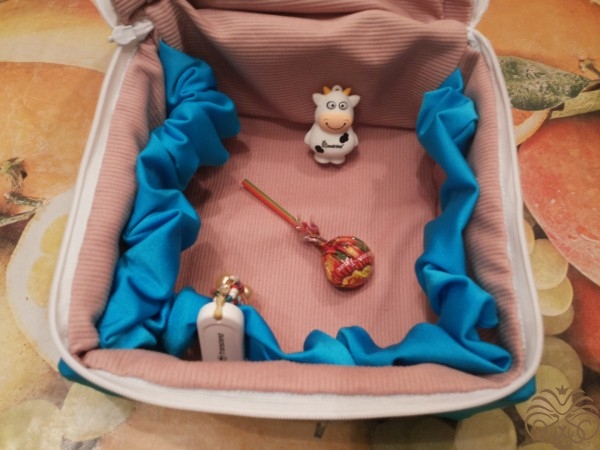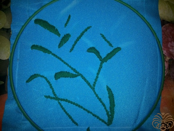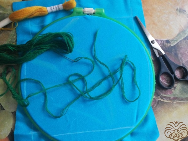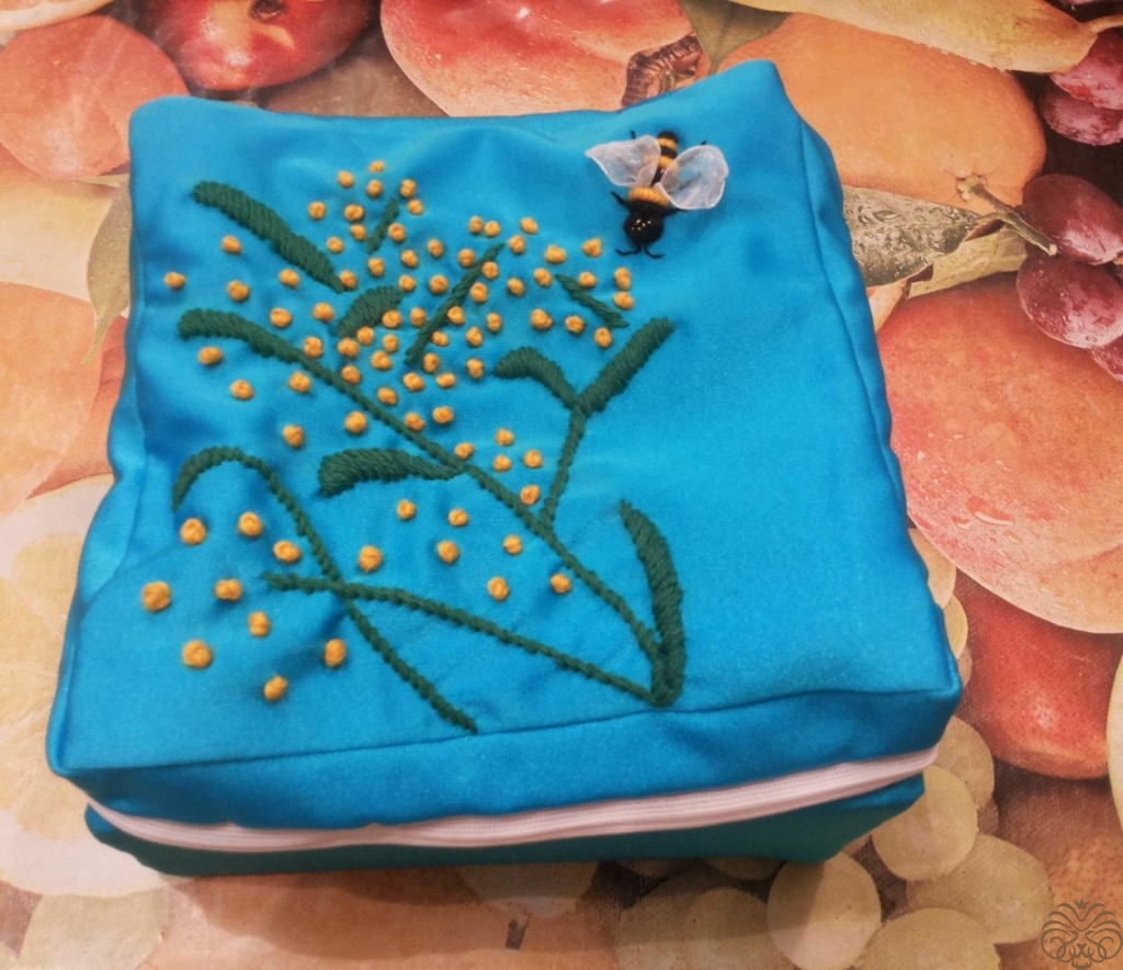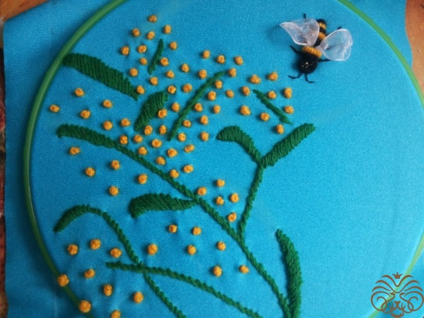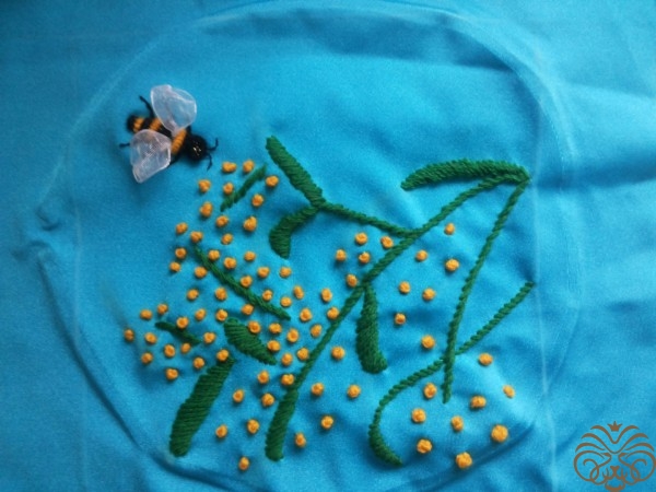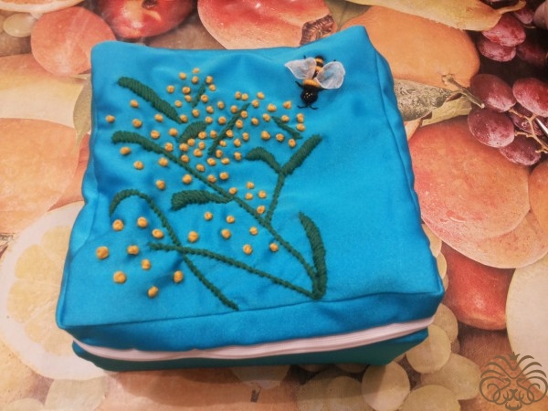 Вышиваем верх шкатулки. Рисуем узор на ткани мелком, вышиваем шерстяными нитками, стебли и листья стебельчатым швом, цветочки французским узелком. Глазки пчелки вышиваем французским узелком, тельце выполняем узелком рококо, чередуя цвета черного и желтого. На вышитом тельце и глазках пчелки золотой нитью делаем блики. Ножки вышиваем в одну нить. Крылья из прозрачной ленты.