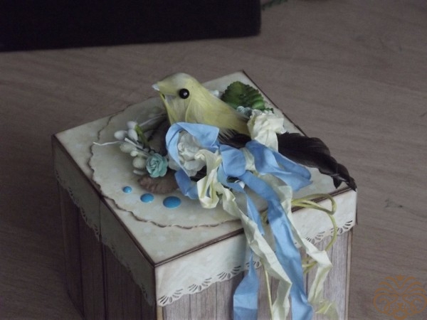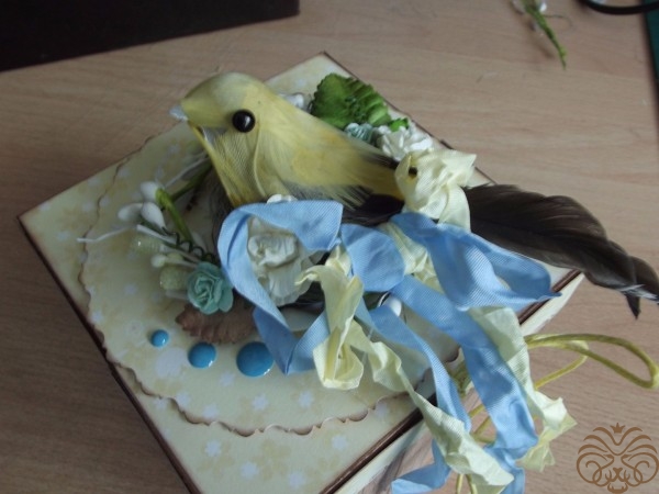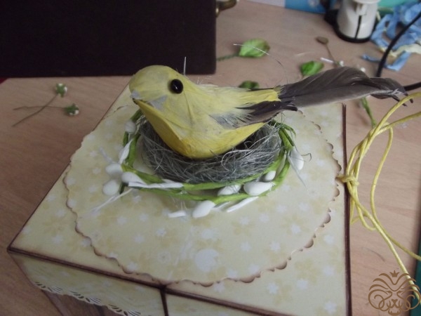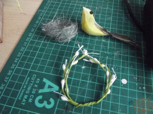 - украшалочки (шебби-ленточки, птичка, веточки искусственной вербы, бумажные листочки и цветы, сизалевое волокно);