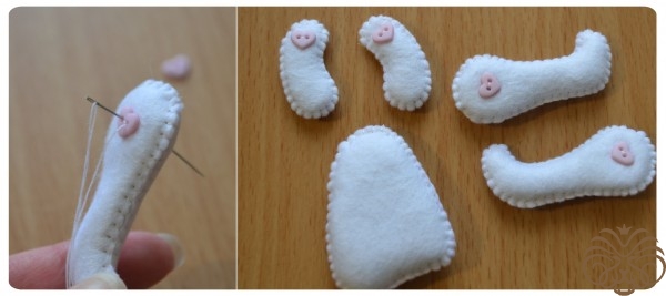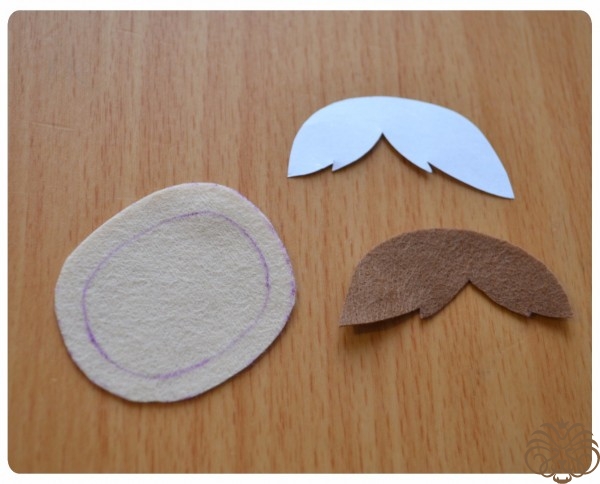3. Инструменты и прочее: самоисчезающий маркер, клей Момент Кристалл, иголка, синтепон, декоративные мелкие пуговицы, помпончик, клеевой пистолет, ножницы, черный мелкий бисер, бантик, румяна, дырокол по фетру, мулине золотого цвета