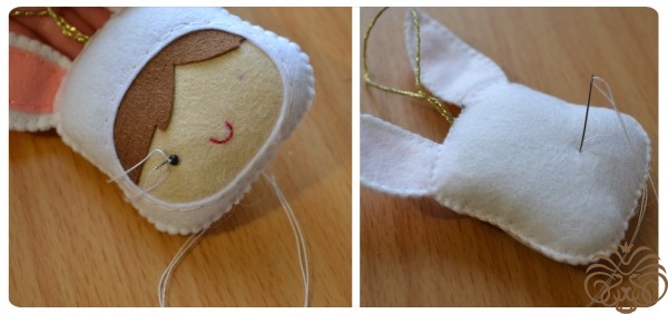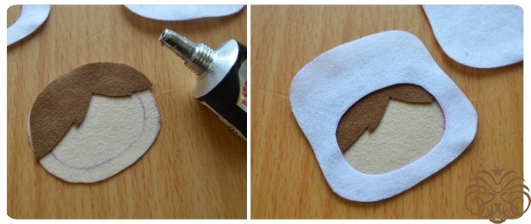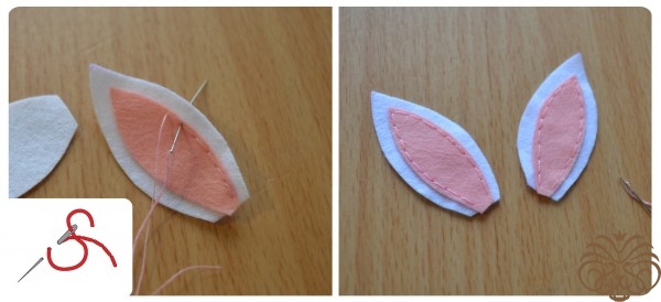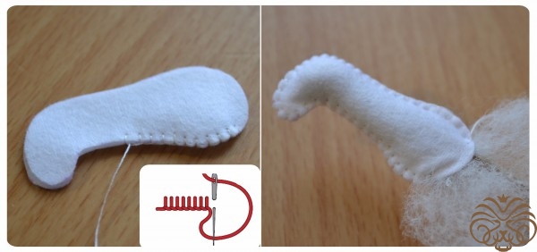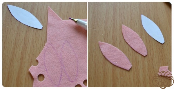 Разогреваем клеевой пистолет и начинаем склеивать детали. Одно ушко загнем. Для этого поставим каплю горячего клея по середине ушка на месте сгиба и согнем ушко. Подержим несколько секунд, чтобы клей закрепился. Отпускаем. Теперь приклеиваем голову к телу, нанеся немного клея на верхний края тельца, а сверху прикладываем голову