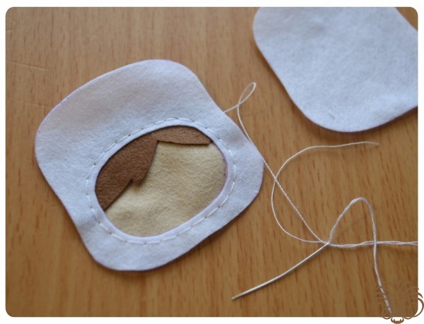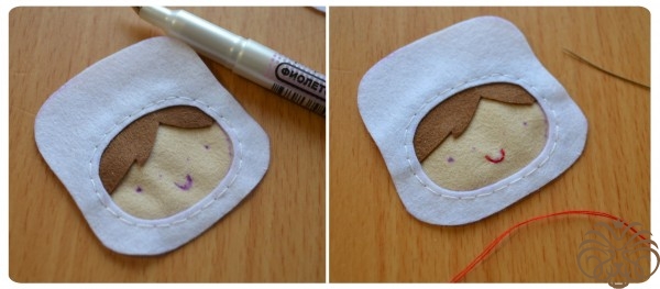 Пришиваем глазки. Для этого сзади головы выберете одну точку где-то по середине и введите нитку с иголкой. Выводим ее сначала в точке, где нарисован, например, правый глаз. Вдеваем на иголку бисеринку и пришиваем ее. При этом выводите и вводите иголку сзади всегда в одной точке сзади. Затем так же пришиваем и второй глаз