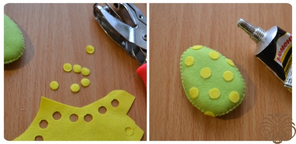 Теперь давайте украсим пасхальной яйцо. Его можно украсить цветочками или полосками. Я решила свое украсить горошком. Дыроколом по фетру вырубаем мелкие кругляшки из желтого фетра. Если у вас нет такого дырокола, то воспользуйтесь маникюрными ножницами. Затем приклеиваем горошек на яйцо клеем Момент Кристалл в хаотичном порядке. Не забудьте украсить яйцо и с задней стороны