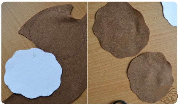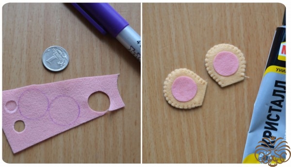 Вырезаем два розовый круглешка. У меня их диаметр совпал с диаметром копеечки, которую я и использовала как деталь, по которой можно обвести круг. Приклеиваем кругляшки на ушки