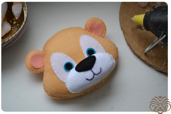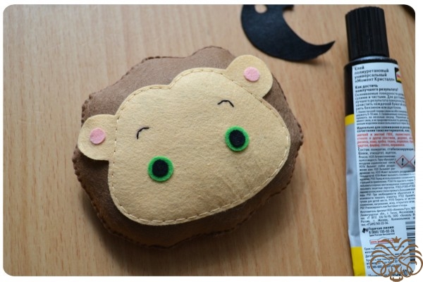 Теперь сделаем тигра! Воспользуйтесь той же самой выкройкой, что и в леопарде, только зеркально отразите все детали, кроме головы и заметите персиковый фетр на рыжий. Также добавьте полоски вместо пятен до сшивания деталей. Я нарезала много одинаковых произвольных полосок и затем приклеивала их одни полностью, другие только край. Затем обрезала торчащие не приклеенные края полосок. Также кончик хвоста я сделала не белый, а черный и повернула его вверх, а не вниз, как было у леопарда. И изменила цвет глаз на зеленый