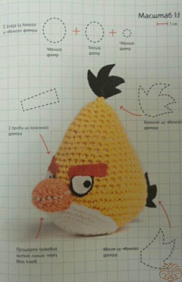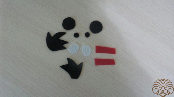 Вырежьте глаза из белого и черного фетра.   хохолок и хвост из черного фетра, а брови - из красного фетра.