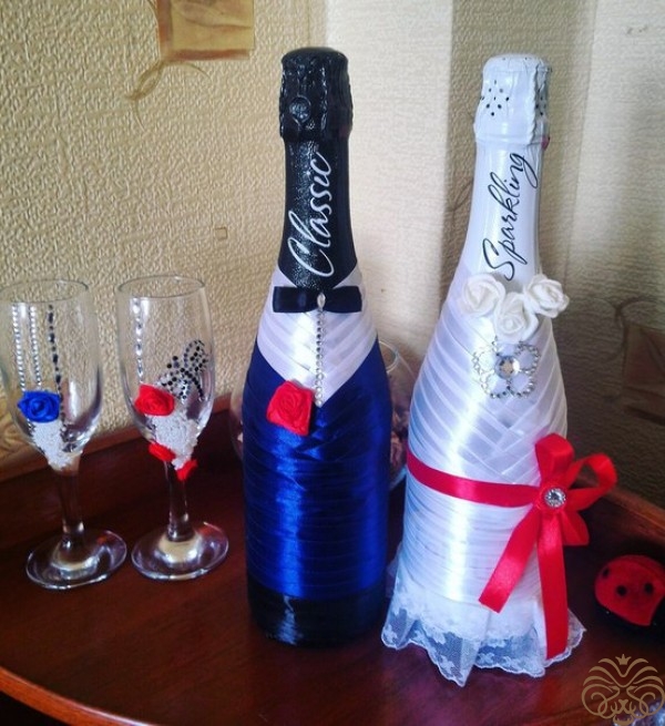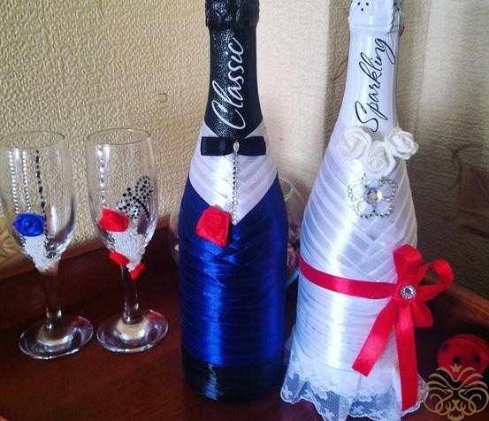 1. атласные ленты, 2. бусинки, стразы 3. 2 бутылки шампанского, 4. 2 бокала