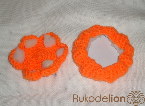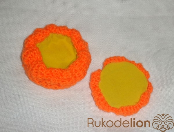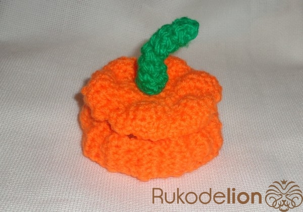 4 ряд просто обвязать. В 5 ряду прибавить через каждые 2 петли. И с 6-16 ряд обвязать по кругу. Вырезать из картона круг под размер дна шкатулки. Приклеить картон и начинает затягивать края тыквы. Для этого проденьте в иглу с большим ушком оранжевую нитку. Продеть иглу по стороне тыкву и затянуть, потом через 3-4 петли продеть иглу и затянуть и так далее.