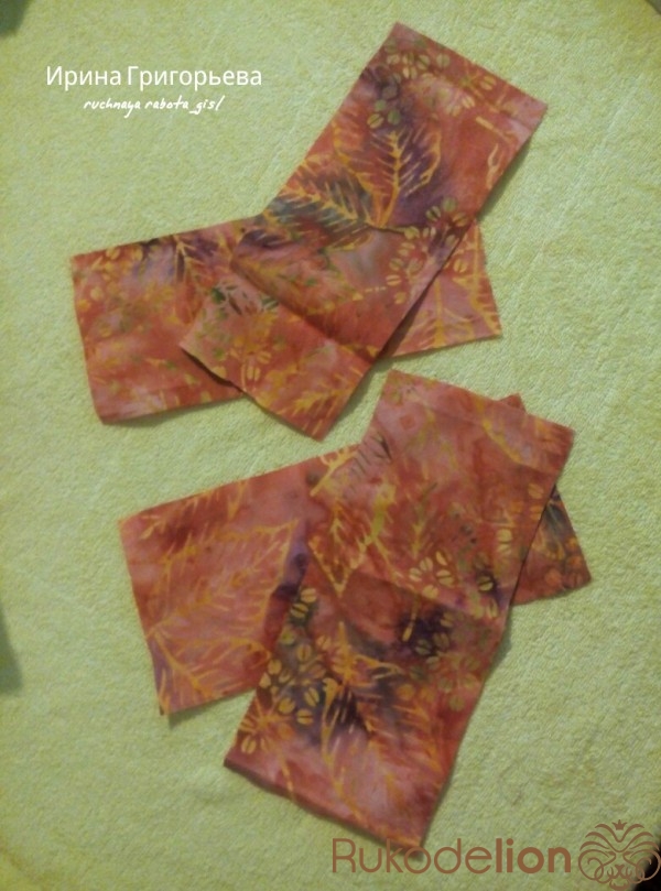 Шаг6. Вырезать из ткани для печворка (2вид) четыре детали 6/16см. +припуски. Сложить по две детали лицом к лицу, стачать, оставляя отверстие для выворачивания. Вывернуть, зашить отверстие. Получились два клапана. Пришить клапаны к верхней части беллпулла.