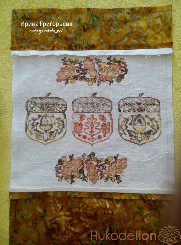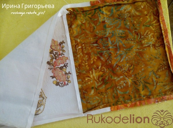 Шаг1. Вышить осенний сюжет, выстирать, отутюжить, обрезать до размера 26,5/25см., оставляя припуски на швы по 1см. с каждой стороны.