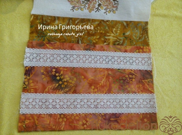 Шаг3. Вырезать из ткани для печворка (2вид) деталь для кармана 26,5/36см. + припуски. Сложить изнанка к изнанке пополам до размера 26,5/18см. Пришить кружево.
