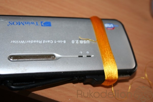 Закончив наматывать продеваем под нитками НЕ вискозную нить несколько раз обматывая таким образом вискозную нитку поперек. Завязываем один узелок.
