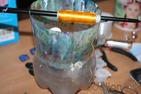 (секрет 1 : вискозная нитка очень скользкая и очень часто в процессе кручения весь обьем нитки сползает с катушки и тогда и сережка и весь моток будут испорчены. Что бы этого избежать я одеваю катушку на кисточку и устанавливаю ее горизонтально)