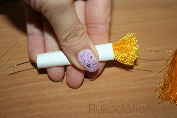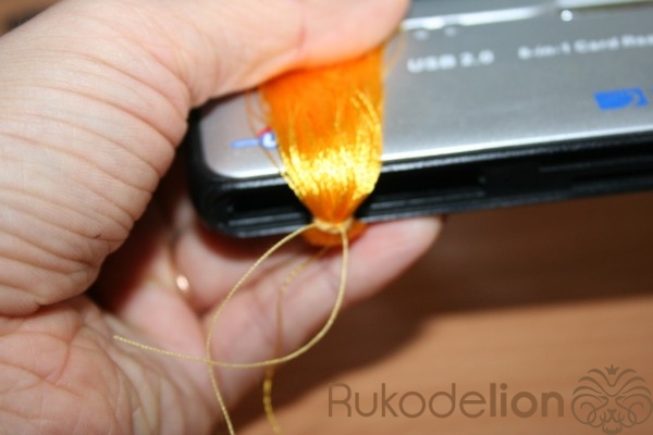 После того как сняли с основы затягиваем не вискозную нитку и завязываем второй узелок. Если делать это на основе то натяжение ниток не даст вам хорошо затянуть обмотки и потом кисточка будет сыпаться.
