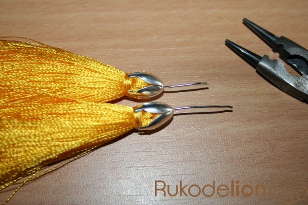 сложив кисточку отступаем пол сантиметра от пина и обматываем кисточку не вискозной ниткой 2-3 витка и узелок. Дальше вариативно, можно оставить так и спрятать это под концевиком или шапочкой для бусины. Можно оплести бисером как на других сережках у меня на фото если надо схему дам там все просто. Но я обматываю сверху еще и вискозной ниткой для красоты.