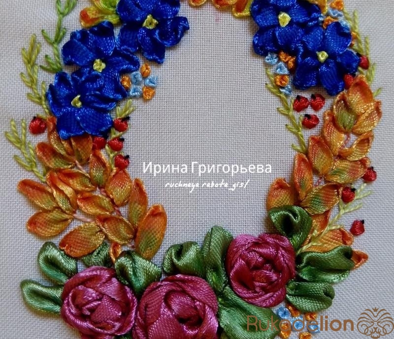Выведите оранжевую ленту ш6мм наружу, уложите её в нужном направлении, проколите ленту иглой и уведите ленту на изнанку. Затягивайте ленту постепенно, пока на её конце не образуется острый уголок (прямой стежок с завитком). Так вышейте все листья оранжевой и жёлтой лентами.