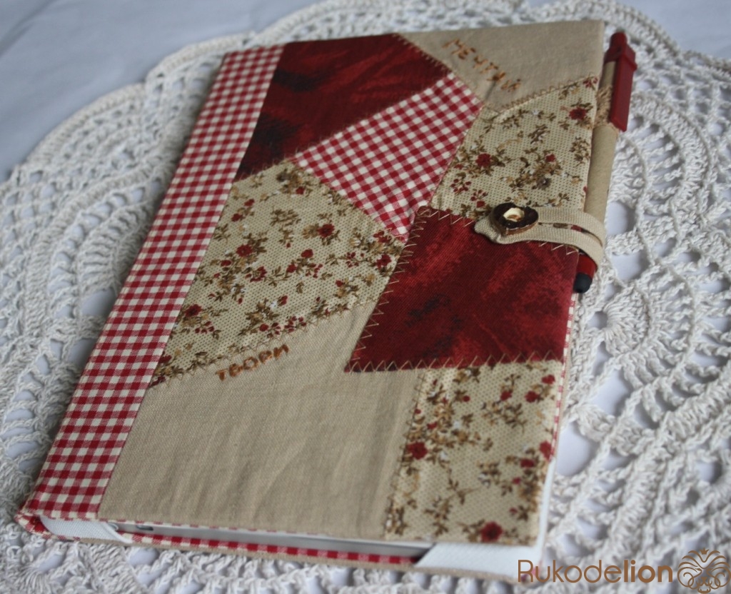 Т.к предусмотрен ещё внутренний кармашек для листочков и визиток, вырезаем из ткани прямоугольник 8 см.*26,5 см. (у меня он сшит из кусочков разной ткани). Делаем подгибку с одной длинной стороны и прошиваем на машинке, с другой длинной стороны делаем подгибку и пришиваем к внутренней стороне чехла на расстоянии 1,5 см. от края. Делаем разделительные строчки. Пришиваем петельку.