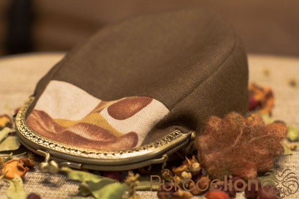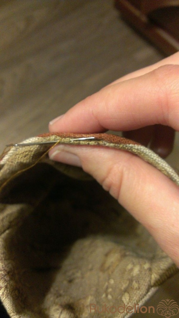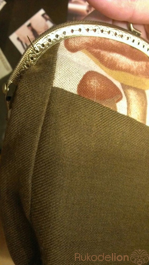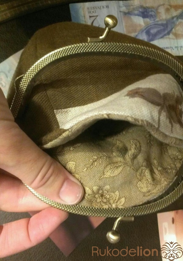 Пришьем фермуар. Пришиваем сначала одну половинку, потом другую. Находим середину в половине кошелька и в фермуаре и начинаем пришивать капроновыми нитками от середины к краю, затем возвращаемся назад, прошиваем до другого конца и опять возвращаемся на середину, получается, что мы прошили сторону дважды. Также пришиваем другую сторону. Готово.