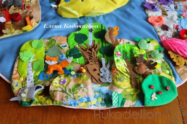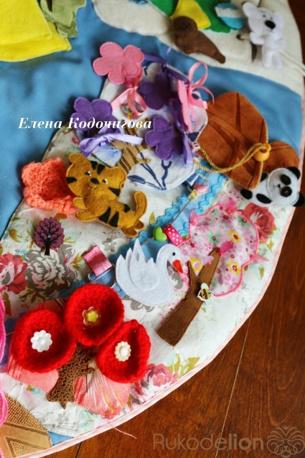 На данный момент это самый большой коврик из сшитых мною)) На коврике поселилось 29 обитателей, среди которых есть животные леса, пустыни, тропиков, Арктики и Антарктиды, а так же жители подводных глубин. На нежном весеннем острове расцвели вязаные и фетровые цветы, а ива так и просит завязать ей косичку.В жаркой Африке в песке спрятались различные предметы, есть счёты, на которых можно считать фрукты, ягоды и листья. Из геометрических фигур малыш может построить мостик от зимнего до осеннего острова, а наряжать ёлочку - это любимое занятие любого ребёнка. Осенний остров пестрит красками. Шуршат деревья, падают жёлуди, ёжик собирает грибы, а малыш поможет ему дойти до своей норки по цифрам-шнуровке. Летний остров тёплый, солнечный и зелёный. На нём всё растёт и грибы, и ягоды, и яблоки. Здесь мы ищем пары каждому жучку и бабочке. На небе можно увидеть радугу, если поставить вместе дождик и солнышко, или устроить ночь с помощью месяца и звёзд, а можно и просто устроить метель. Прищепки, пуговки, молния, карабины, пряжки, всевозможные виды кнопок и крючков, искалка, лабиринт, крестики-нолики - далеко не весь список заданий. С таким ковриком любой малыш сможет надолго увлечься игрой и окунуться в мир сказок и фантазий.