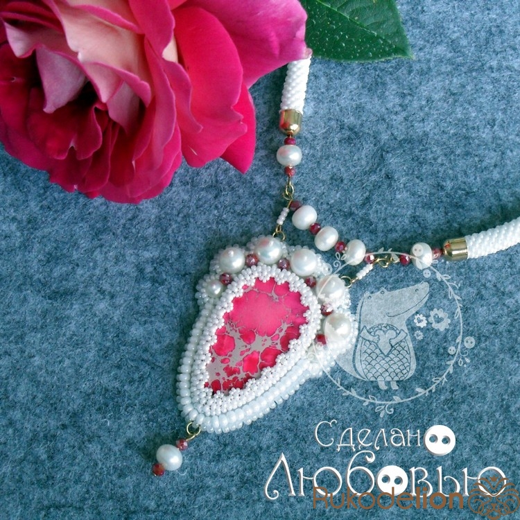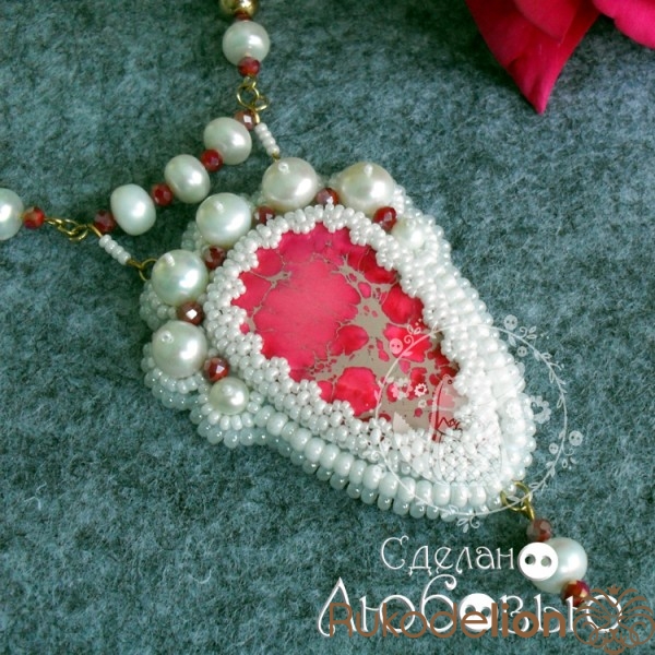 Кулон "Бело-розовый" с розовым варисцитом, жемчугом, хрустальными бусинами и японским бисером. Обратная сторона кожа.