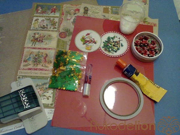 - различные декоративные элементы: цветы пуансетии, искусственный снег, блестки-звездочки, гель с блестками