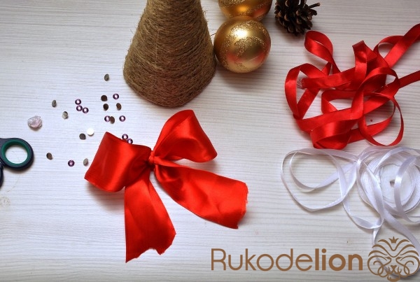 картон, ножницы, клеевой пистолет, шпагат, атласные ленты разной ширины и цвета, клеевые стразы, сосновая шишка.