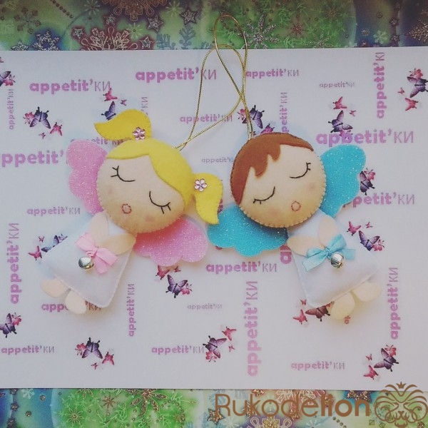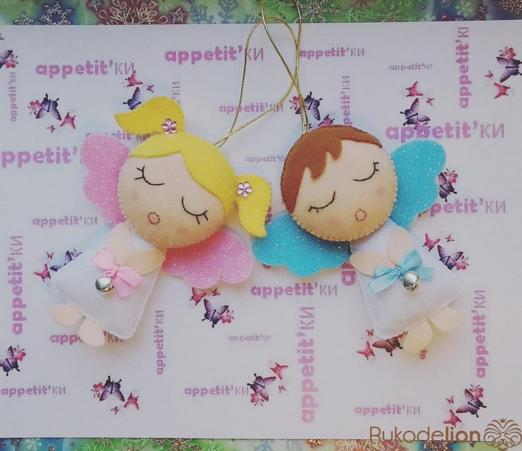 Новогодние игрушки ангелочки, сшиты полностью вручную из фетра, украшены бубенцами, стразами и атласными ленточками, блестками.