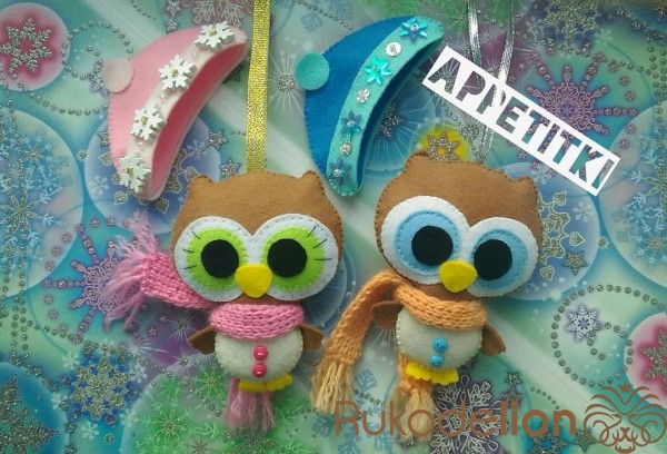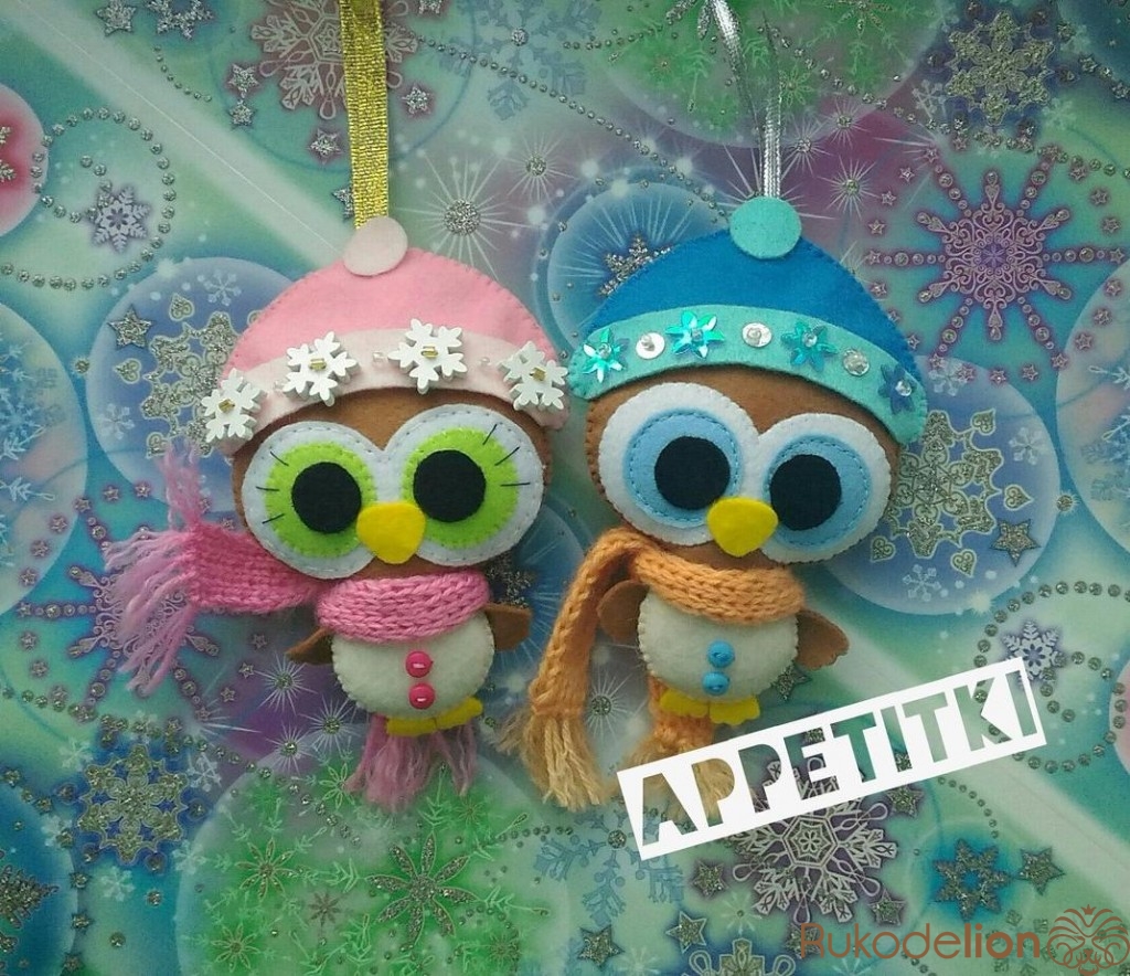 Елочные игрушки совята сшиты полностью вручную (без использования швейной машинки) из фетра. Украшены пуговицами, паетками, бисером. Шарфики вязаные. Шапочки снимаются.