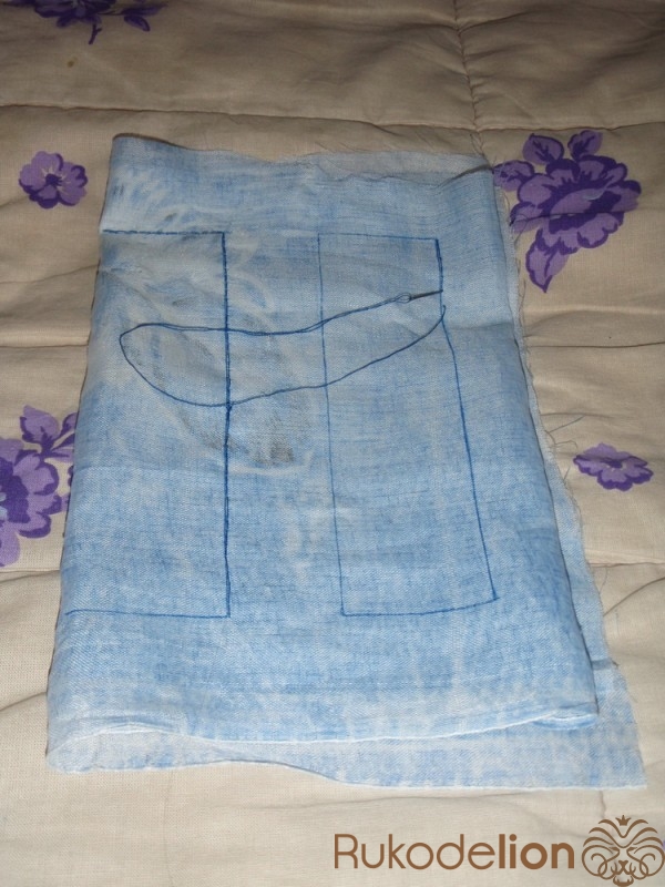 2.1) По тому же принципу, по которому были нарисованы очертания чехлов для частей сидения, изображаем такие очертания для чехла "несущей конструкции" :-). На фото мы можем наблюдать тканевой сгиб в верхней части сложенной голубой материи - это, как мы знаем - уже готовая сторона чехла, не нуждающаяся в прошивании. От этой условной стороны - проводим ещё линии. Вот и получилась модель следующего прямоугольного чехла.