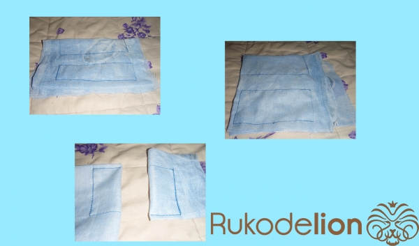 2.2) На этом фото (второе фото коллажа) можно увидеть результат декорирования. Этот творческий процесс: изображение синих линий - мы осуществили - сразу после пришивания к передней части спинки двух боковых элементов и одного верхнего. Теперь - как на фото - пришиваем обыкновенными вертикальными стежками нижнюю часть. Она здесь расположена впереди, но это - для большей наглядности. На самом деле эта светло-розовая часть находится внизу. А впереди - декорированная голубая. Потом мы её повернём правильно - по окончанию процесса пришивания.
