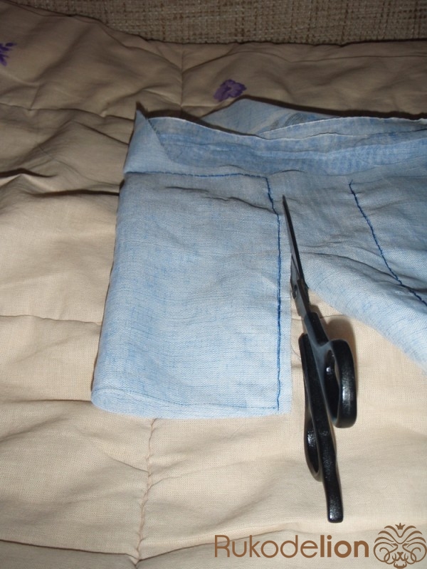 1.3) Когда прошили - вырезаем, отступив немного места. Вот, как получилось в итоге. Швом "за иголку" здесь прошиты нижние и правые стороны. Верхние стороны - это отверстия. Левые - тканевые сгибы.