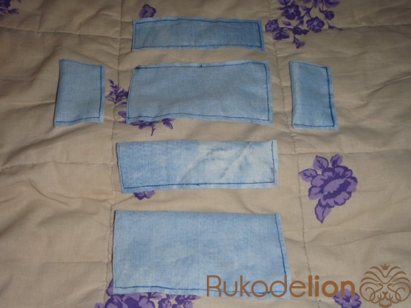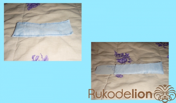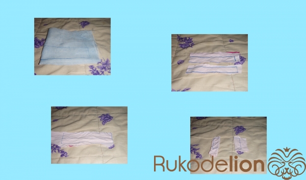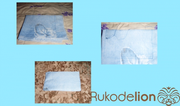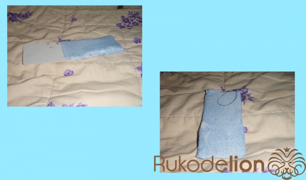 2.1) Это - будущий чехол для передней части спинки. Здесь тканевой сгиб сложенной материи у нас уже небольшой - он выпал на короткую линию-сторону будущего чехла. Его можно увидеть в левой части голубой материи. Поэтому - линии для прошивания у нас теперь в другом расположении: длинная + вторая длинная. Прошиваем швом "за иголку" одну длинную линию, затем (после закрепления нити узелком) - ещё одну, параллельную ей.
