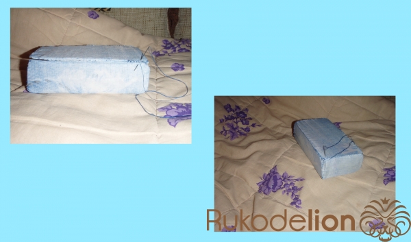 1.2) Вот картонное дно уже и внутри чехла. Теперь - требуется скрепить ту часть, которая ранее служила отверстием для вставки картонного каркаса. Скрепляем её швом "петельным", как на втором фото нашего коллажа.