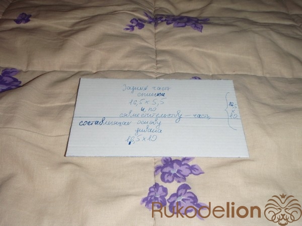 2.2) С нижней частью спинки получилось ещё сложнее. Необходимой ткани - светло-розовой материи, как задумано по дизайну дивана - было настолько мало, что рисовать модель чехла пришлось... на разрозненных лоскутках материи. Да, на мебельных "фабриках" :-) встречается и такое: дефицит нужного материала. Вот и на нашей Мизтике - светло-розового материала оказалось не слишком много. Но - не беда, выход из положения найден :-). На фото - две стороны будущего чехла для нижней части спинки. Их мы затем сошьём вместе, швом "петельным" - тем самым, которым мы зашивали отверстие чехла после вставки картона.