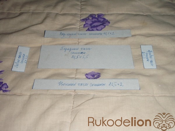 2.3) С чехлом для верхней части спинки повезло больше - здесь материи хватило :-). На фото - вид материи с изнанки. Нарисованная модель - примерно совпадает с моделями предыдущих чехлов, только здесь она - в развёрнутом виде. Вырезав эту модель, мы её заранее вывернем на лицевую сторону, согнём по центральной горизонтальной линии, и также будем сшивать швом "петельным".