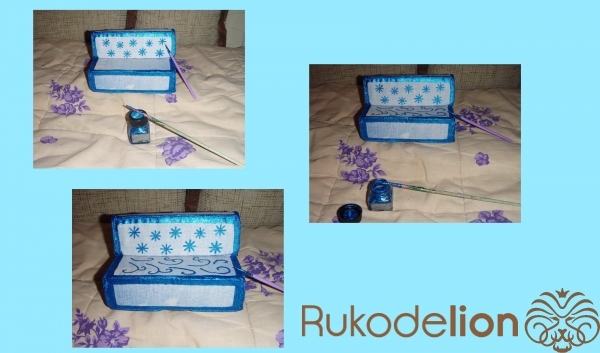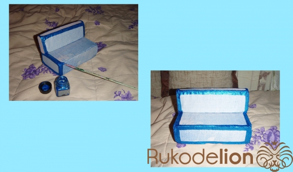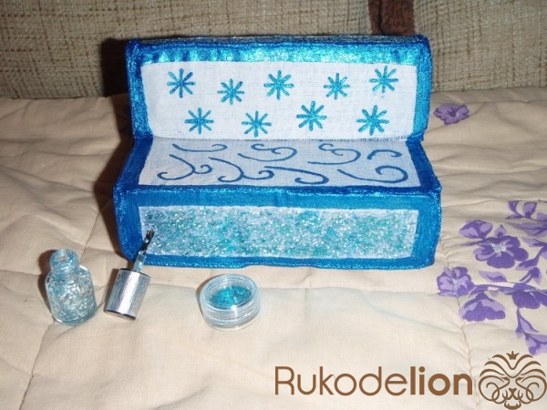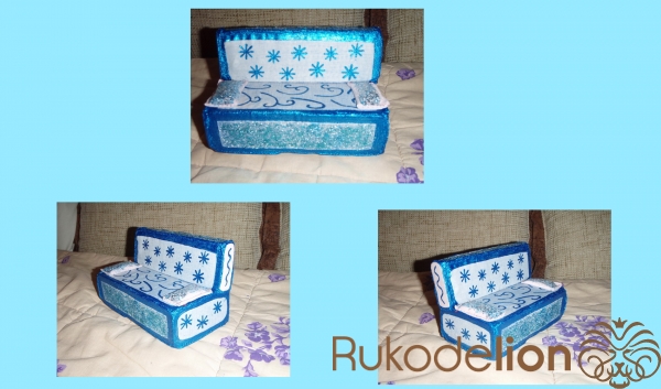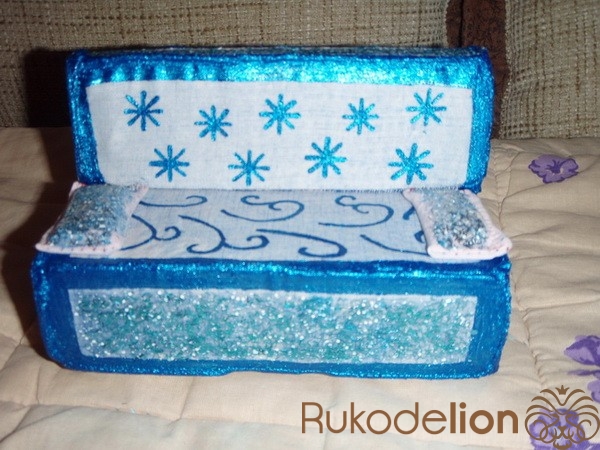 1) Примерно тем же образом декорируем две части дивана: переднюю часть сидения и верхнюю часть спинки. Красим лаком, затем - посыпаем голубыми блёстками и приглаживаем кисточкой. Наносим дополнительный закрепляющий слой лака.