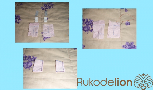 2.1) А вот и наши, уже прошитые чехлы - которые затем нужно будет только вырезать, оставляя место с каждой стороны вокруг чехла: примерно по полсантиметра, можно и больше. На первом фото коллажа - крупным планом чехлы для передней и задней частей. Чехол, что расположен выше - имеет тот самый тканевой сгиб, который прошивать не нужно. Следовательно, на нём прошиты швом "за иголку" - только одна короткая и одна длинная линии. Чехол же, что находится ниже - не имеет тканевого сгиба. И из его линий, таким образом, являются прошитыми целых три: длинная-короткая-длинная.