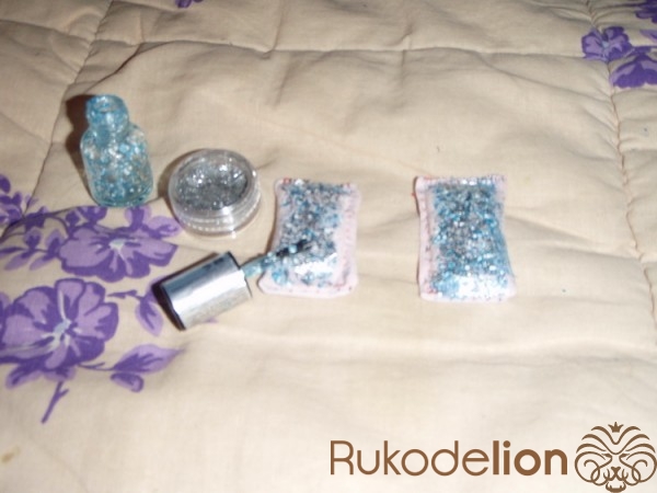 3) Наносим, в декоративных целях, на одну из ручек - лак для ногтей, с блёсточками :-). Затем - берём серебристые блёстки, насыпаем их на "лакированную поверхность", приглаживаем кисточкой для лака. Сверху желательно нанести ещё один лаковый слой - чтобы блёстки лучше держались. То же самое - проделываем и с другой диванной ручкой.
