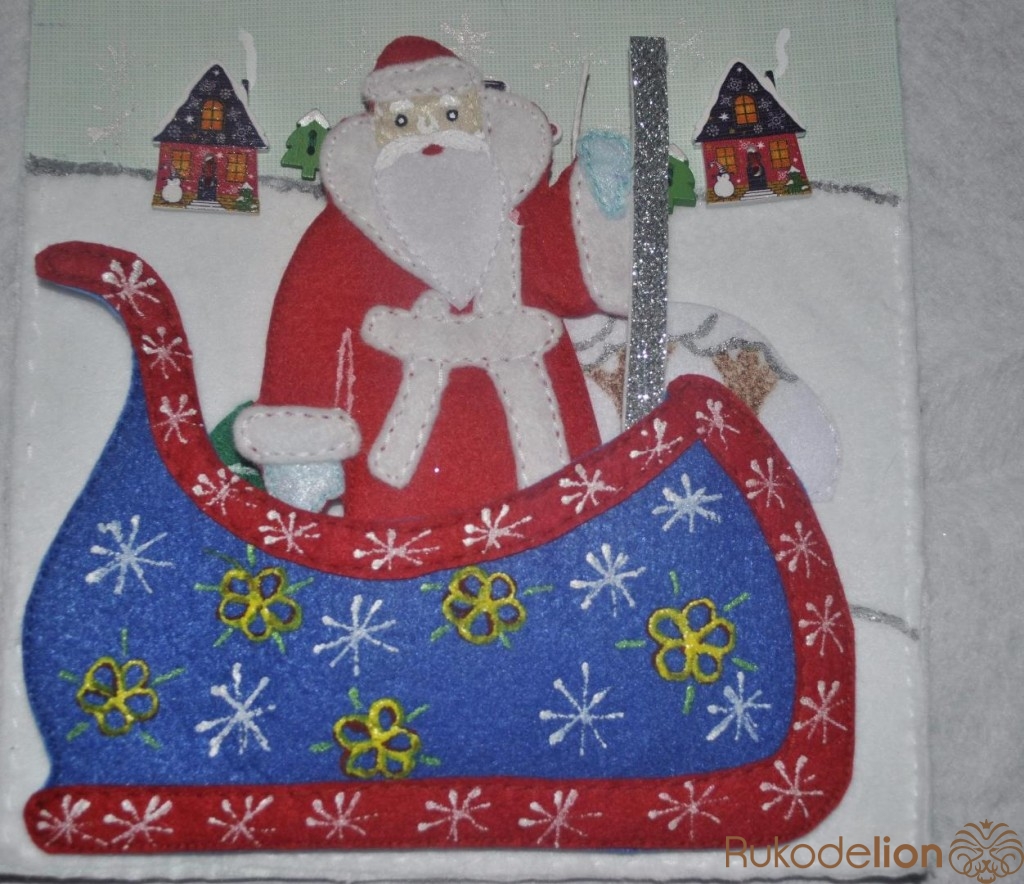 Шьем сани .Вырезаем детали из синего и красного фетра,на вторую часть санок устанавливаем первую часть магнитной кнопки.Сначала пришиваем к саням детали из красного фетра,потом сшиваем обе детали швом вперед иголка только три части санок,сверху не сшивать,получается санки ввиде кармана.Украшаем санки красками для ткани.