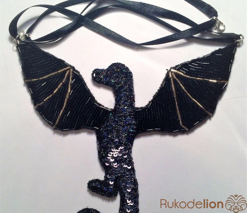 Ожерелье, выполненное в виде черного дракона с переливающейся чешуей из пайеток и блестящими черно-золотыми крыльями.