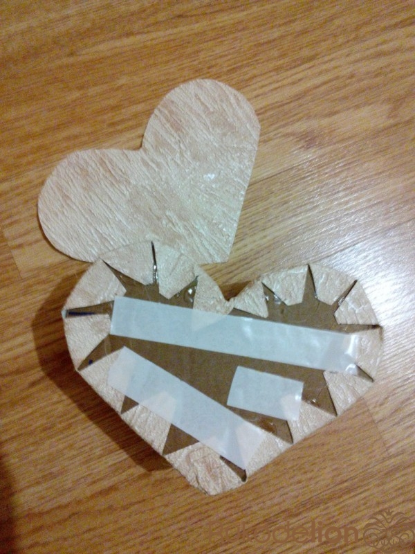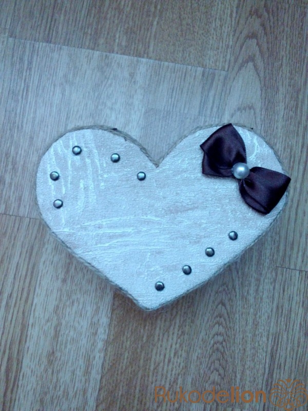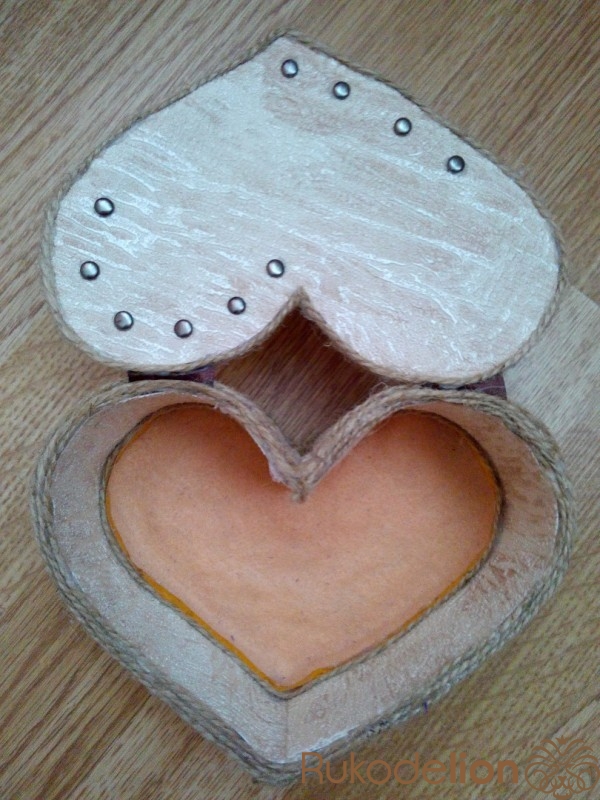 3. Приступаем к формированию каркаса. Две прямоугольных детали (для боковых стенок) необходимо хорошо «промять», чтобы они лучше загибались. Затем поочередно приклеиваем одну и вторую деталь к основанию (дну) коробочки. Итак, каркас готов. Приступаем к упаковке. Начнем с упаковки крышки. Для этого берем сердце из бумаги большего размера и по его краям делам надрезы (для отгиба). Приклеиваем бумажную деталь к основной при помощи клея-карандаша, оставляя место для отгиба. Затем, с помощью клеевого пистолета приклеиваем отгиб к внутренней стороне крышки. Внешняя сторона готова. Крышка коробочки будет крепиться лентами. В местах крепления крышки на двухсторонний скотч крепим ленты длиной 3-4 см, оставляя свободный край для дальнейшего крепления к коробке. Ленты с двух сторон необходимо заранее обжечь, чтобы они не расползались. На внутреннюю сторону крышки на двухсторонний приклеиваем сердце из бумаги, подготовленное для внутренней стороны. Затем контур сердца декорируем шпагатом. Приступаем к упаковке самой коробочки. Сначала обклеим боковые стороны. По краям прямоугольников большего размера вырезаем зубчики (для отгиба). Поочередно клеим их на внешнюю сторону боковых стенок. Отгибы приклеиваем клеевым пистолетом с одной стороны (вовнутрь коробочки) и с другой (на внешнюю сторону дна коробочки). Для упаковки дна приклеиваем заранее подготовленное сердце из бумаги к внешней стороне дна. Декорируем шпагатом по краю основания, как и в случае с крышкой. Приступаем к упаковке внутренней части коробочки. Для начала нам необходимо соединить крышку с основанием. Для этого вовнутрь коробочки на двухсторонний скотч приклеиваем свободные края лент крышки. Далее приклеиваем прямоугольные детали из бумаги по внутренним сторонам стенок на двухсторонний скотч. Декорируем верхний край шпагатом. На дно коробочки приклеиваем сердце из фетра. Внутри коробочки по краю основания декорируем золотой лентой и шпагатом.