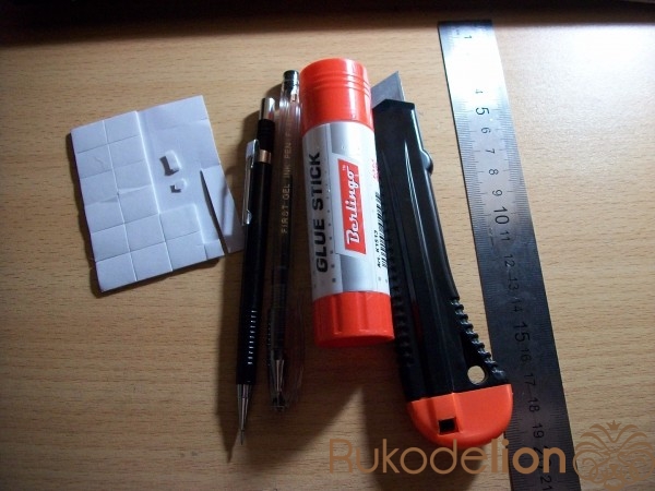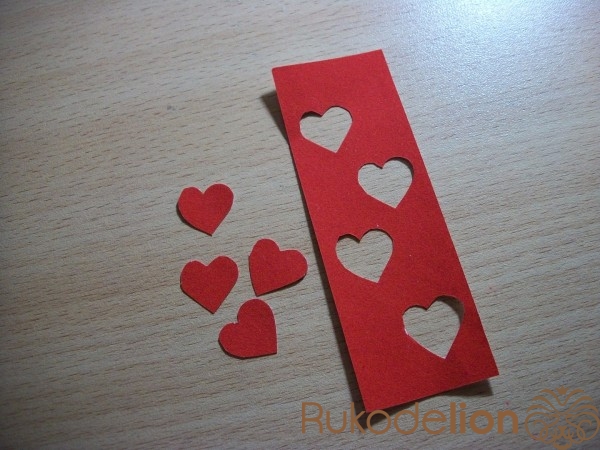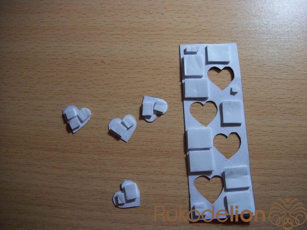Берем небольшой отрезок бархатной бумаги ее размер 4x 11,6 см и на ней вырезаем сердечки. Приклеиваем вспененный скотч.