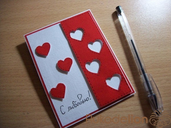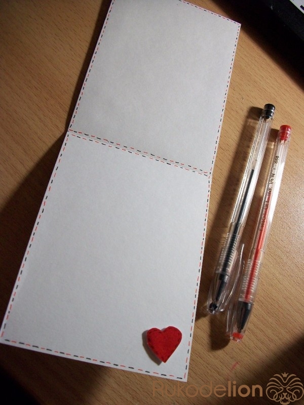 Приклеиваем к открытке. Черной гелиевой ручкой обводим сердечки и бархатный отрезок с вырезанными сердечками по контуру пунктирной линией имитируя строчку от швейной машинки. Внутри открытку так же оформляем маленьким сердечком и обводим по контуру ручкой. Открытка готова.