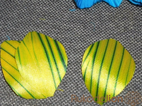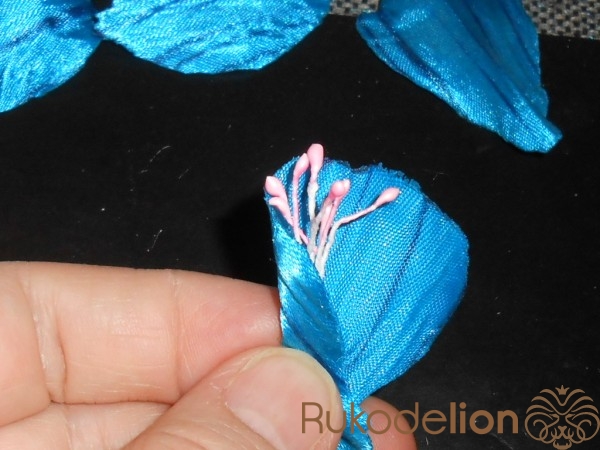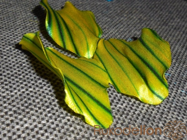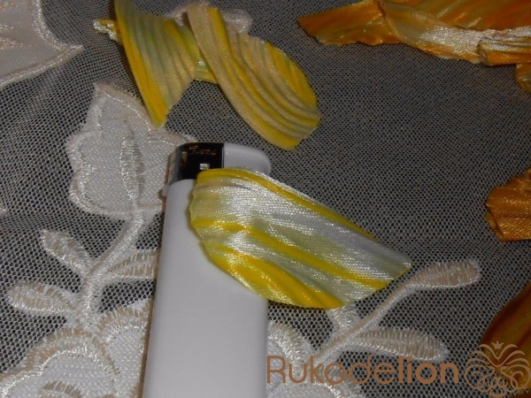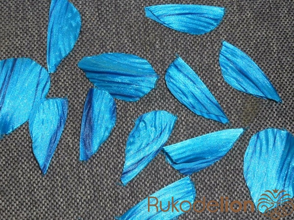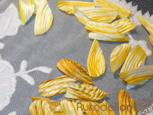 Лепестки гофрируем с помощью утюга с паром.Складываем лепесток пополам и выкладываем на тонкий материал по диагонали.Накрываем краем материала и прижимаем утюгом.Край материала вместе с вложенным лепестком как-бы вытягиваем из-под утюга.Не спешите иначе гофрирование будет не равномерным.После гофрировки оставляем лепестки на несколько минут для просушивания.