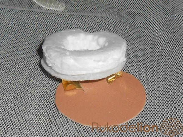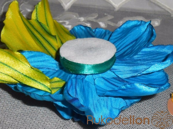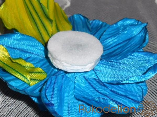 Из пенопласта толщиной 0,5 см вырезаем круг с дырочкой посередине, приклеиваем к фетру того же диаметра но без дырочки и всё вместе сажаем на цветок.Пенопласт сбоку обклеиваем ленточкой шириной 0,5 см, т.е. маскируем пенопласт.И сверху приклеиваем кожзам с застёжкой. Если вы захотите сделать цветок интерьерным то можно приклеить круг из атласной ленты или кожзама .